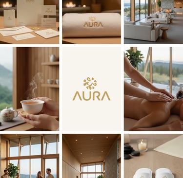 The Concept A visual identity crafted for a sanctuary. Drawing inspiration from the quiet radiance of "golden hour," the AURA brand language blends ethereal warmth with the grounding textures of nature. The design does not just identify the space; it sets the atmosphere—an invitation to exhale, characterized by champagne gold tones, soft light, and tactile elegance.